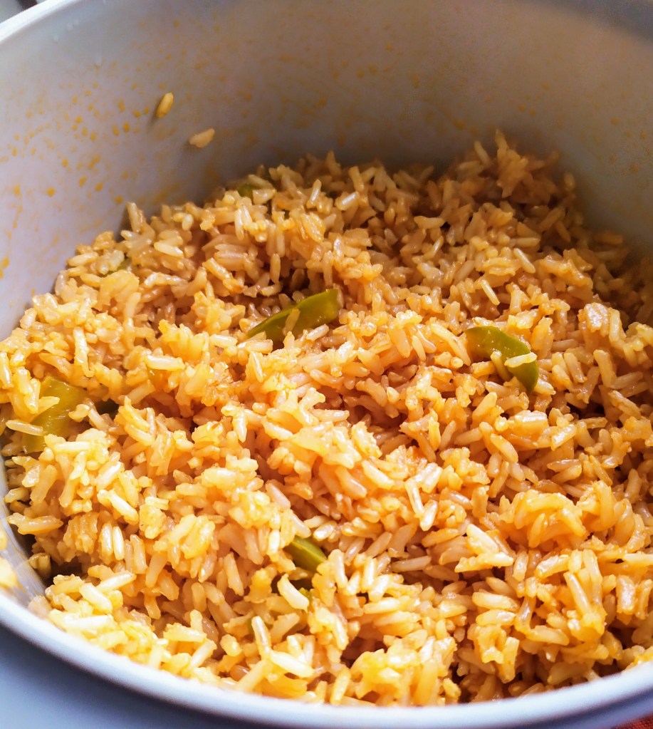 - Dans un plat allant au micro-ondes, mélanger le riz lavé, la sauce, l’huile, les épices, le poivron coupé en dés