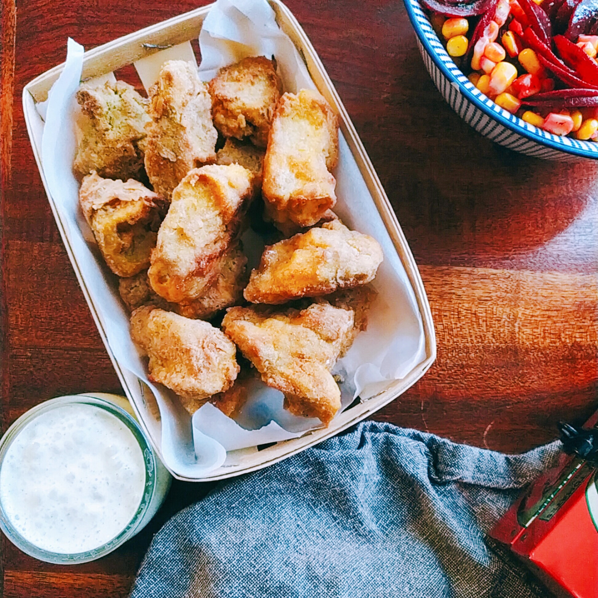 - Mélange humide panure: 40 cl de crème végétale ( soja, riz, amande….), 2 c à s de fécule de maïs, 1 pointe de curcuma, sel, ail en poudre, poivre, épices(paprika, piment,….)