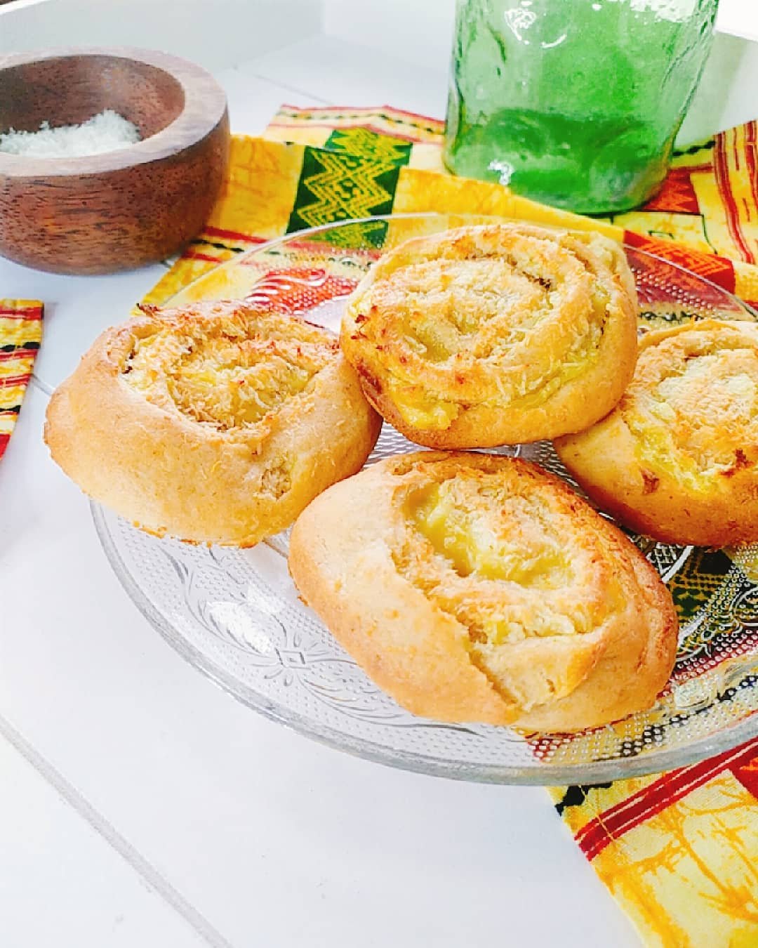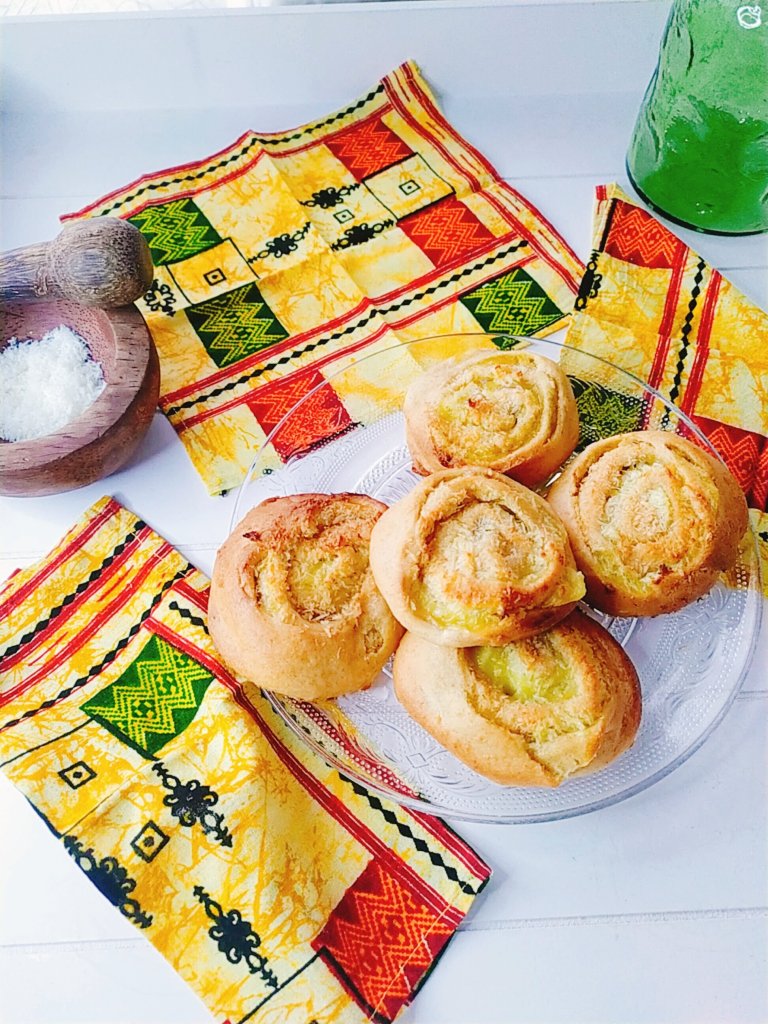 - Préparer la pâte en mélangeant les ingrédients secs, ajouter le lait de coco et la margarine en pétrissant quelques minutes.