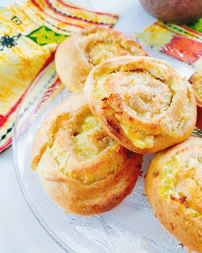 Des petits pains ultra savoureux. Une pâte utilisable pour de multiples viennoiseries : roulés, brioche, pommes cannelle, chaussons….. Ici j’ai réalisé une crème pâtissière au lait de coco mais celui-ci est remplaçable par n’importe quelle boisson végétale : avoine, amande, soja, épeautre,……